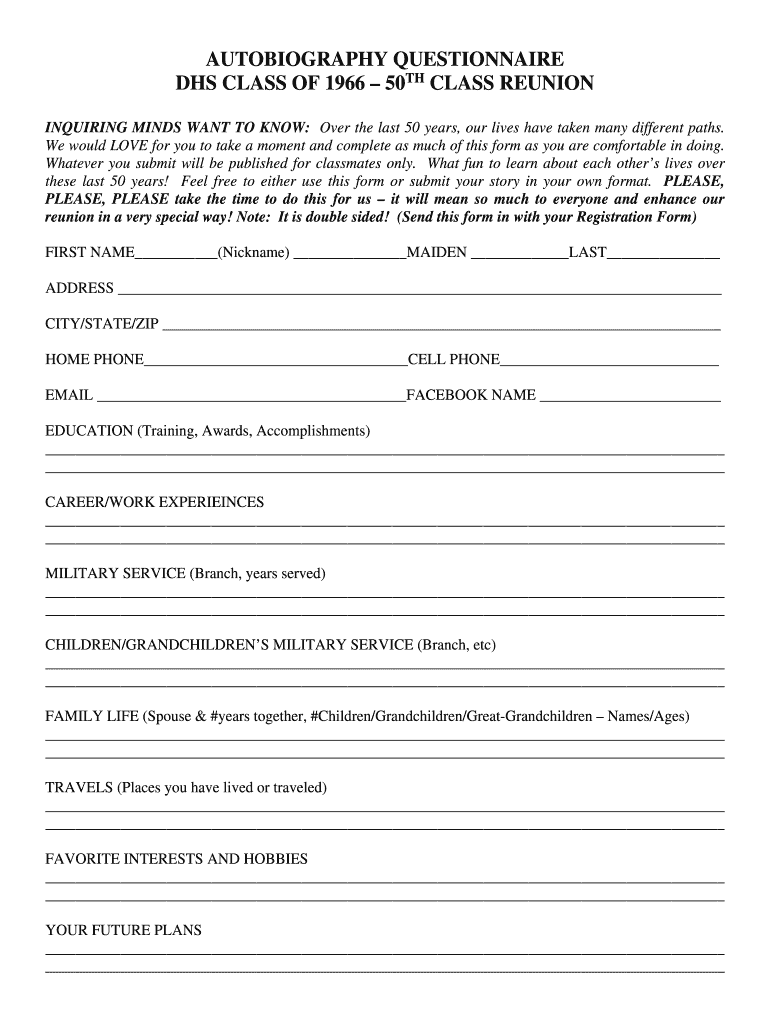 AUTOBIOGRAPHY QUESTIONNAIRE DHS CLASS OF 1966 50TH CLASS REUNION INQUIRING MINDS WANT TO KNOW: Over the last 50 years, our lives have taken many paths. We would LOVE for you to take a moment and complete