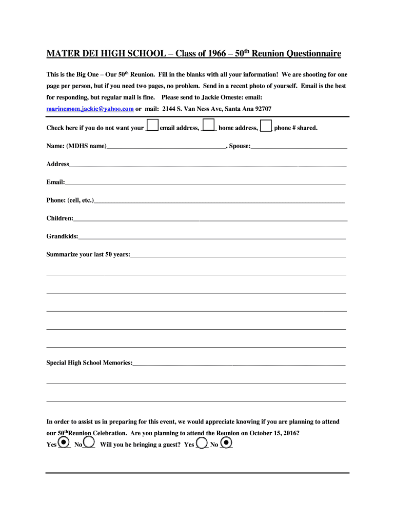 MATER DEI HIGH SCHOOL Class of 1966 50th Reunion Questionnaire This is the Big One Our 50th Reunion. Fill in the blanks with all your information! We are shooting for one page per person, but if you