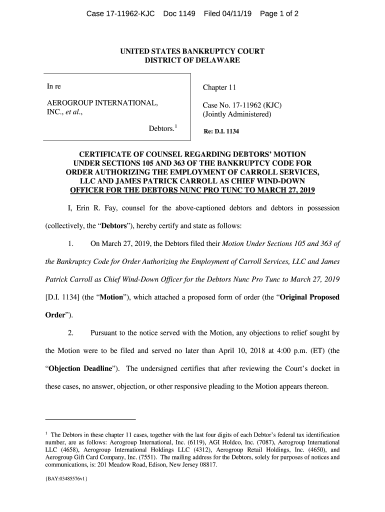 Case 1711962KJCDoc 1149Filed 04/11/19Page 1 of 2UNITED STATES BANKRUPTCY COURT
