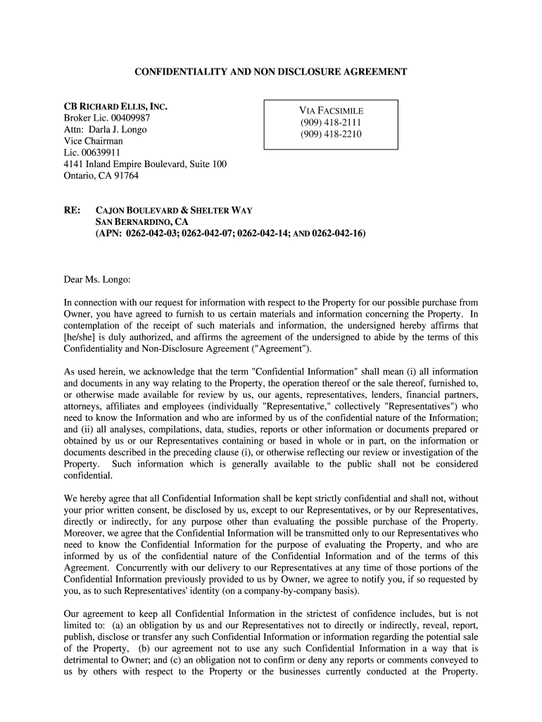 CONFIDENTIALITY AND NON DISCLOSURE AGREEMENT CB RICHARD ELLIS, INC. Broker LIC. 00409987 Attn: Darla J. Long Vice Chairman LIC. 00639911 4141 Inland Empire Boulevard, Suite 100 Ontario, CA 91764RE:VIA