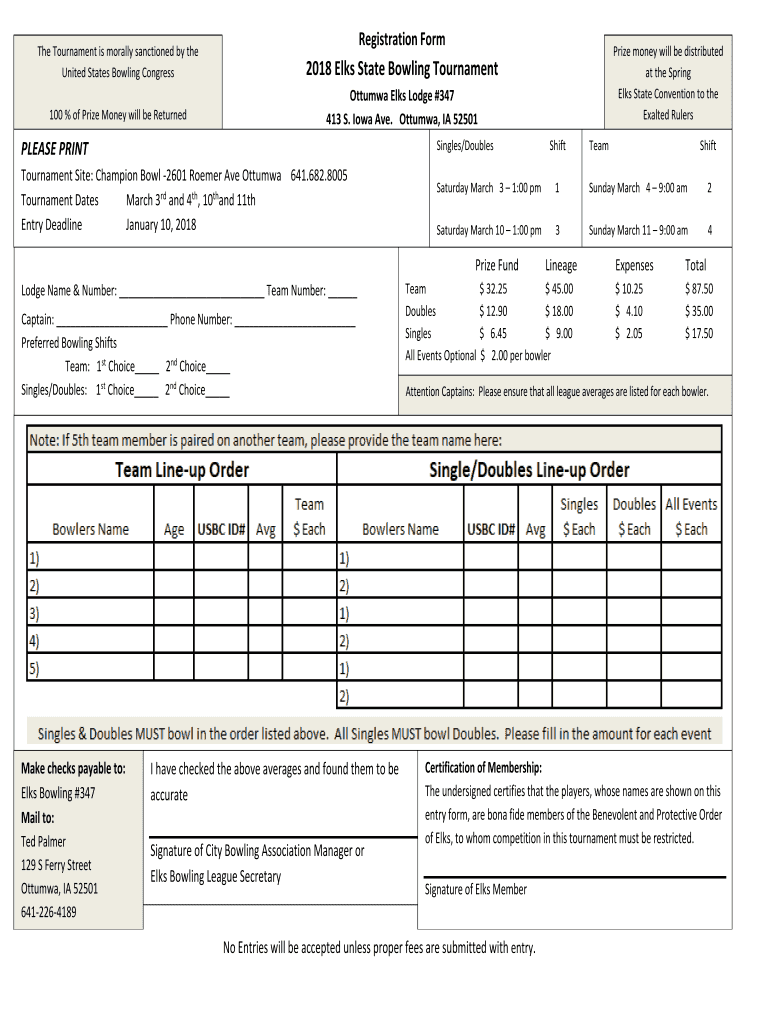 TheTournamentismorallysanctionedbythe UnitedStatesBowlingCongress 100×ofPrizeMoneywillbeReturnedRegistrationForm OttumwaElksLodge×347 413S. Iowa Ave. Ottawa,IA52501PLEASEPRINT Tournament Site:ChampionBowl2601RoemerAveOttumwa641.682.8005