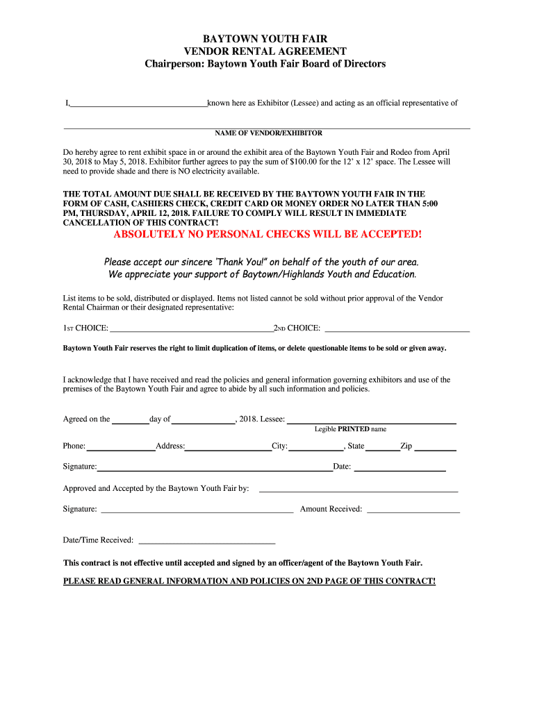Chairperson: Baytown Youth Fair Board of Directors, known here as Exhibitor (Lessee) and acting as an official representative name OF VENDOR/Exhibitors hereby