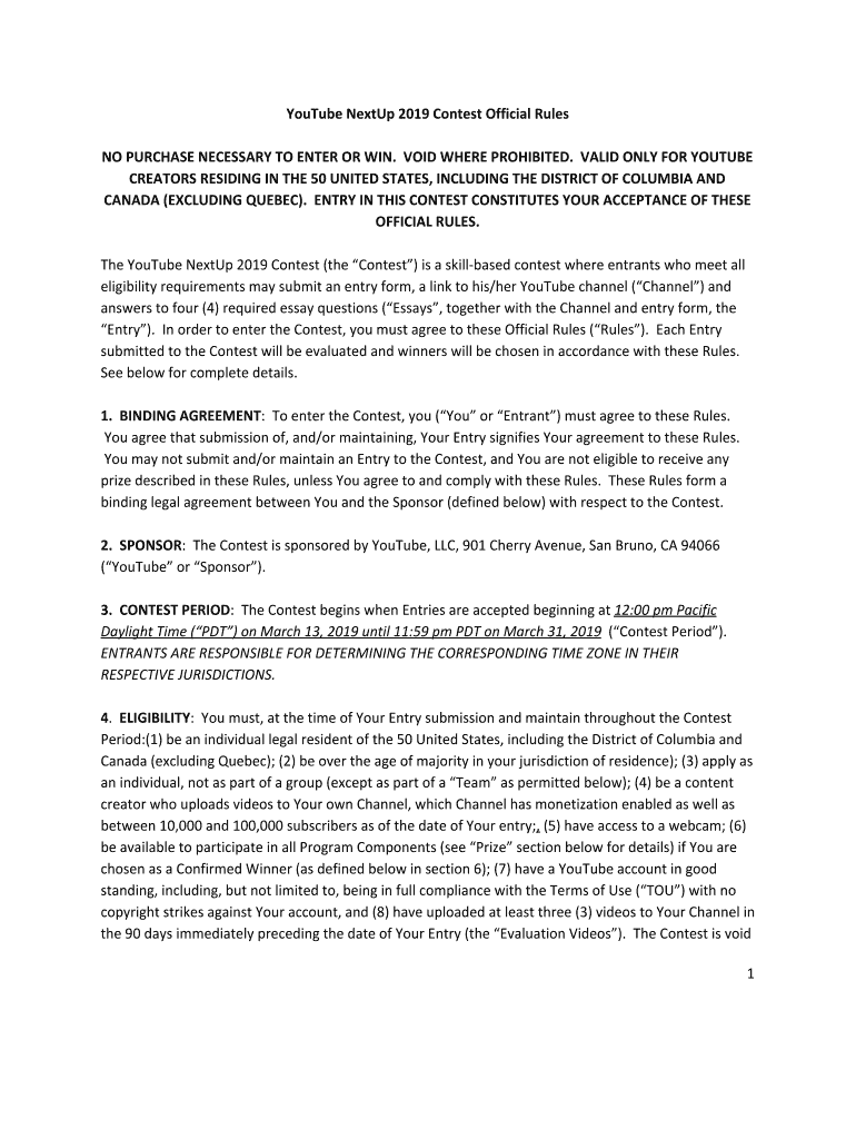 NO PURCHASE NECESSARY TO ENTER OR WIN. VOID WHERE PROHIBITED. VALID ONLY FOR YouTube