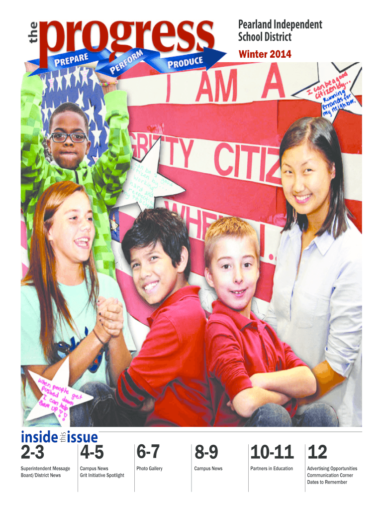 Pearland Independent School District Winter 201423thisinside issue Superintendent Message Board/District News45Campus News Grit Initiative Spotlight67 Photo Gallery89Campus News1011 12 Partners in