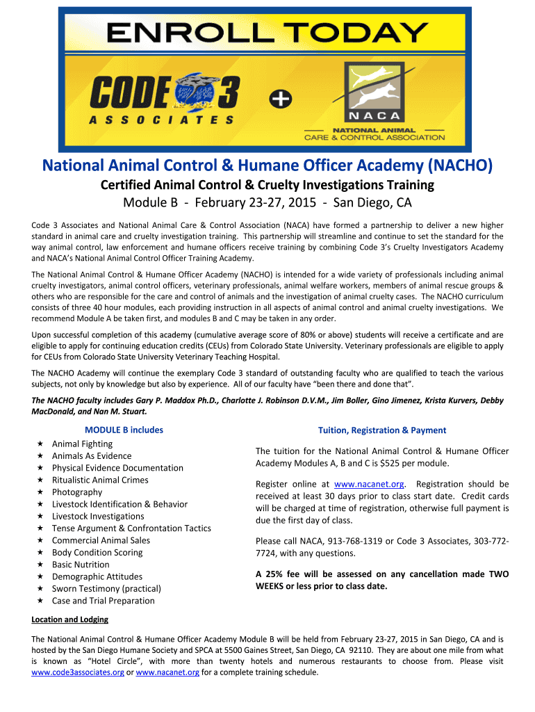NationalAnimalControl&HumaneOfficerAcademy(NACHO) CertifiedAnimalControl&CrueltyInvestigationsTraining ModuleBFebruary2327,2015SanDiego,CA Code 3 Associates and National Animal Care & Control Association