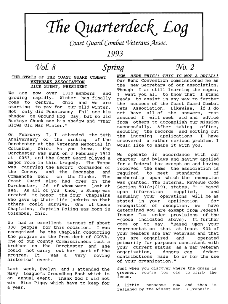 Role Quarterdeck, Coast quardCom6at veterans assoc.1993VoL 8SpringTHE STATE OF THE COAST GUARD COMBAT VETERANS ASSOCIATION DICK STENT, President are now over 1330 members and growing rapidly. Winter