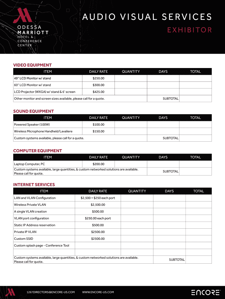 AUDIO VISUAL SERVICES E × H I B I TO VIDEO EQUIPMENT STEADILY RATE49 LCD Monitor w/ stand×250.0060 LCD Monitor w/ stand×300.00LCD Projector (WGA) w/ stand & 6 screen×425.00QUANTITYOther monitor