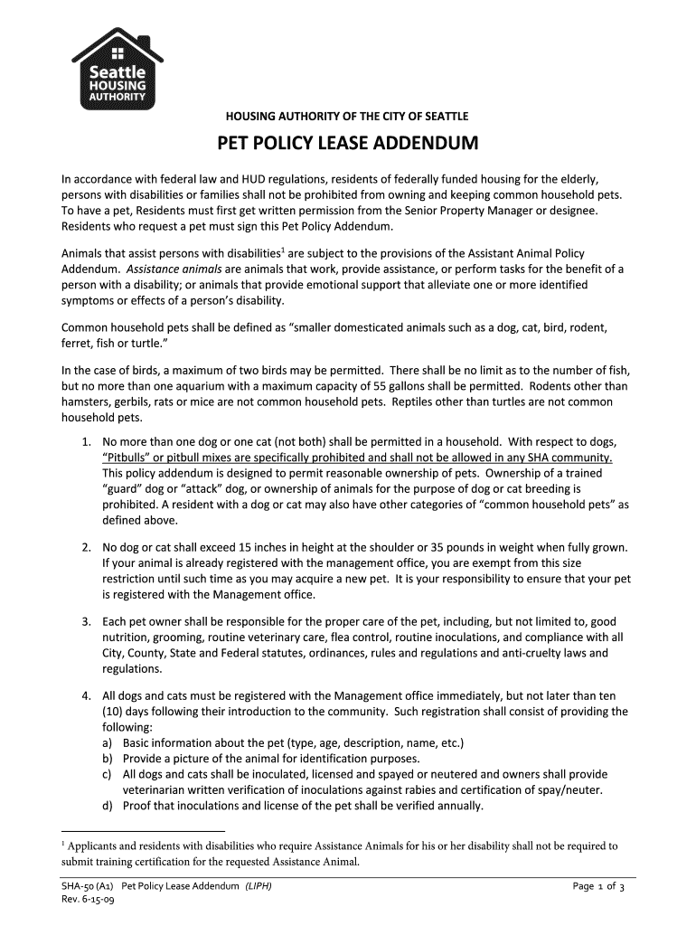 HOUSINGAUTHORITYOFTHECITYOFSEATTLE PETPOLICYLEASEADDENDUM InaccordancewithfederallawandHUDregulations, residentsoffederallyfundedhousingfortheelderly, personswithdisabilitiesorfamiliesshallnotbeprohibitedfromowningandkeepingcommonhouseholdpets.
