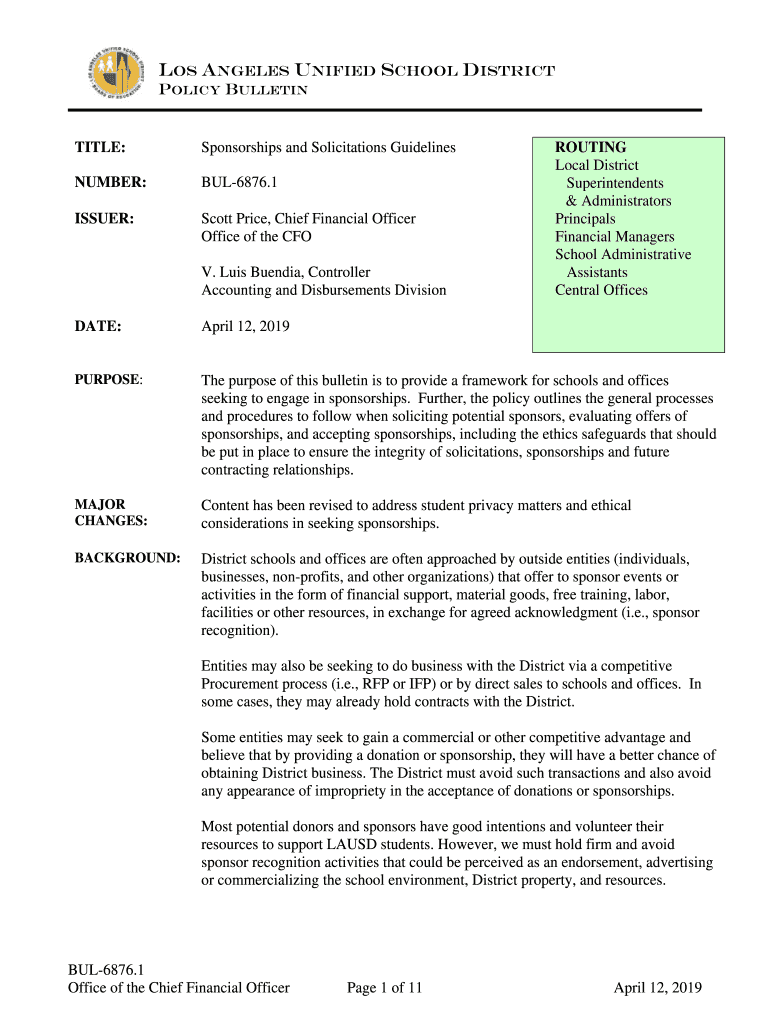 LOS ANGELES UNIFIED SCHOOL DISTRICT POLICY BULLETINTITLE:Sponsorships and Solicitations GuidelinesNUMBER:BUL6876.1ISSUER:Scott Price, Chief Financial Officer Office of the CFO V. Luis Brenda, Controller