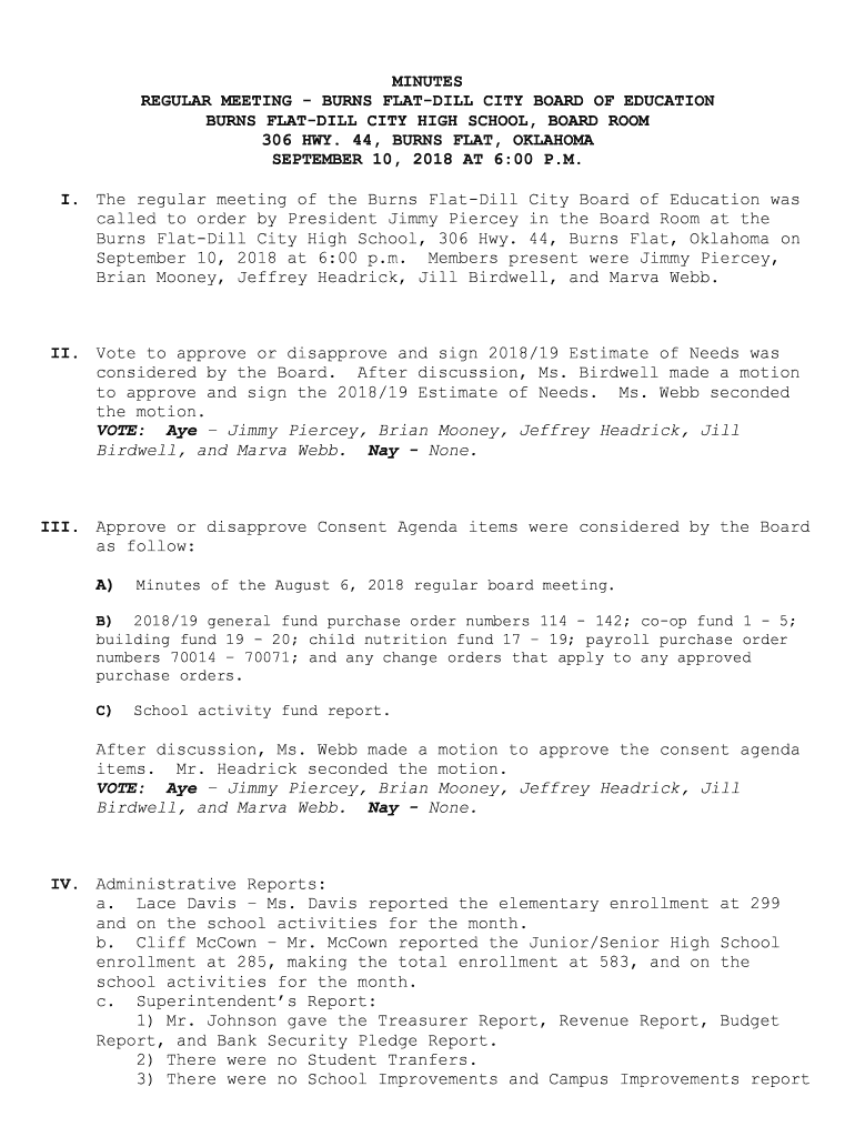 MINUTES REGULAR MEETING BURNS FLOTILLA CITY BOARD OF EDUCATION BURNS FLOTILLA CITY HIGH SCHOOL, Boardroom 306 HWY. 44, BURNS FLAT, OKLAHOMA SEPTEMBER 10, 2018, AT 6:00 P.M. I. The regular meeting