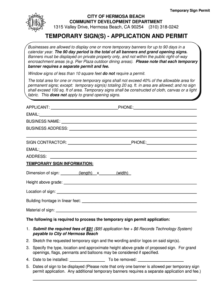 Temporary Sign Permitting OF HERMOSA BEACH COMMUNITY DEVELOPMENT DEPARTMENT 1315 Valley Drive, Hermosa Beach, CA 90254 (310) 3180242TEMPORARY SIGN(S) APPLICATION AND PERMIT Businesses are allowed