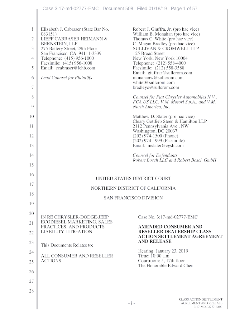 Case 3:17md02777EMC Document 508 Filed 01/18/19-Page 1 of 5715Elizabeth J. Career (State Bar No. 083151) LIEF CAREER HERMANN & BERNSTEIN, LLP 275 Battery Street, 29th Floor San Francisco, CA 941113339