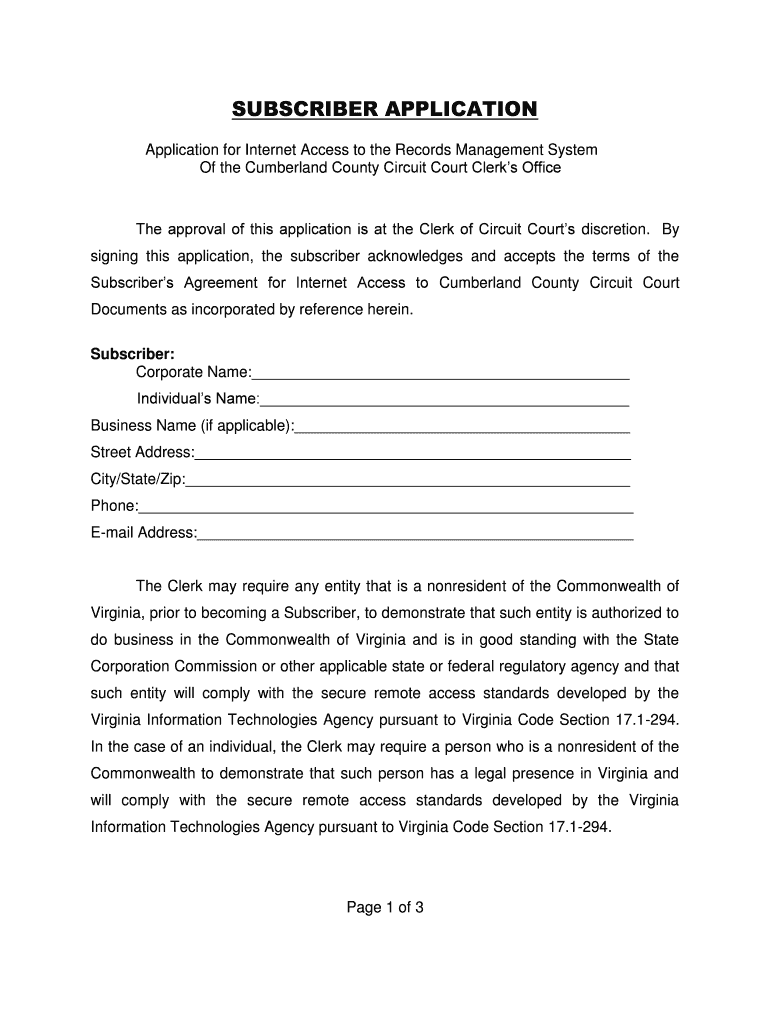 SUBSCRIBER APPLICATION for Internet Access to the Records Management System Of the Cumberland County Circuit Court Clerks Office approval of this application is at the Clerk of Circuit Courts discretion.