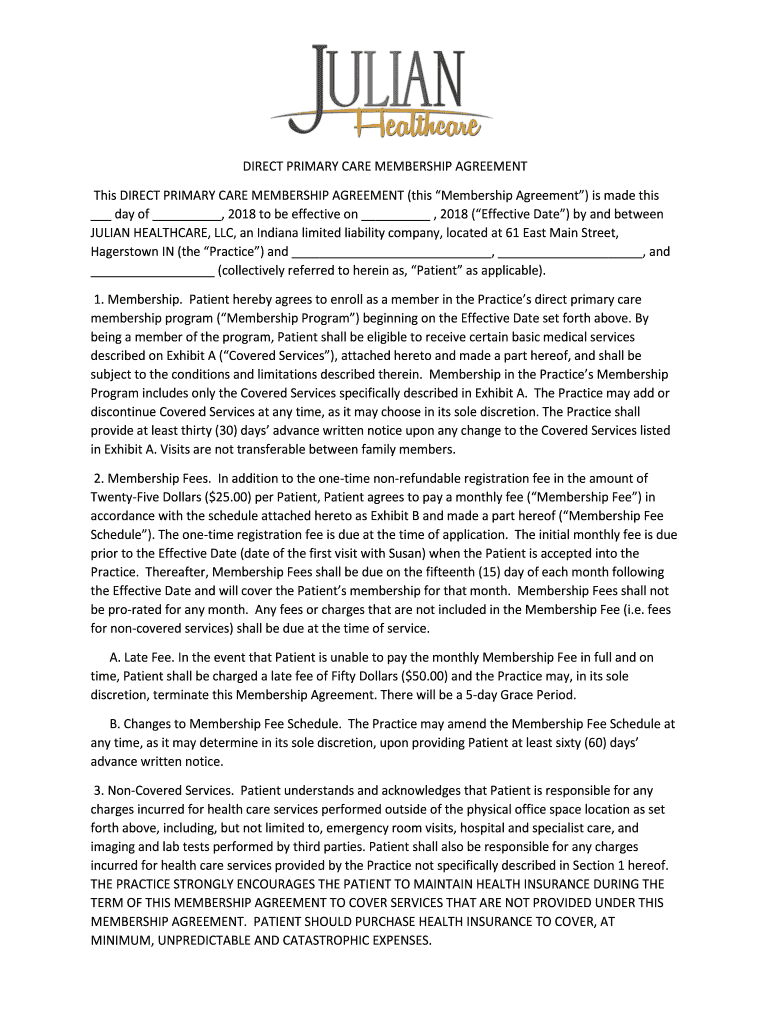 DIRECT PRIMARY CARE MEMBERSHIP AGREEMENT This DIRECT PRIMARY CARE MEMBERSHIP AGREEMENT (this Membership Agreement) is made this day of, 2018 to be effective on, 2018 (Effective Date) by and between