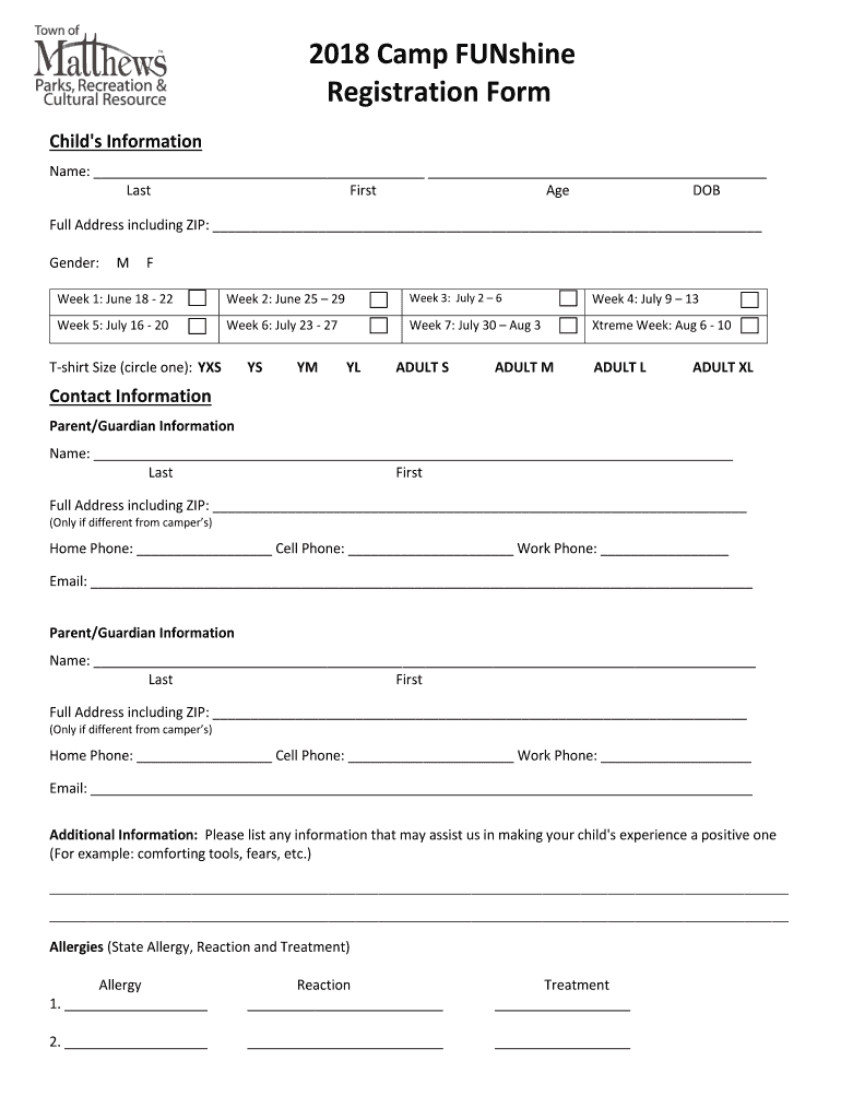 Get the free 2018 Camp FUNshine Registration Form - matthewsnc.gov