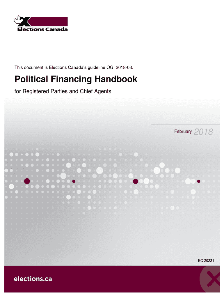 This document is Elections Canada's guideline CGI 201803. Political Financing Handbook for Registered Parties and Chief AgentsFebruary2018EC 20231Table of Contents 3Table of ContentsAbout This Document