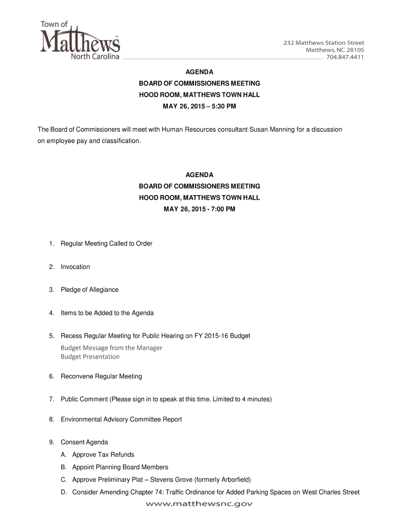 AGENDA BOARD OF COMMISSIONERS MEETING HOOD ROOM, MATTHEWS TOWN HALL MAY 26, 2015 5:30 PMT he Boards of Commissioners will meet with Human Resources consultant Susan Manning for a discussion on employee
