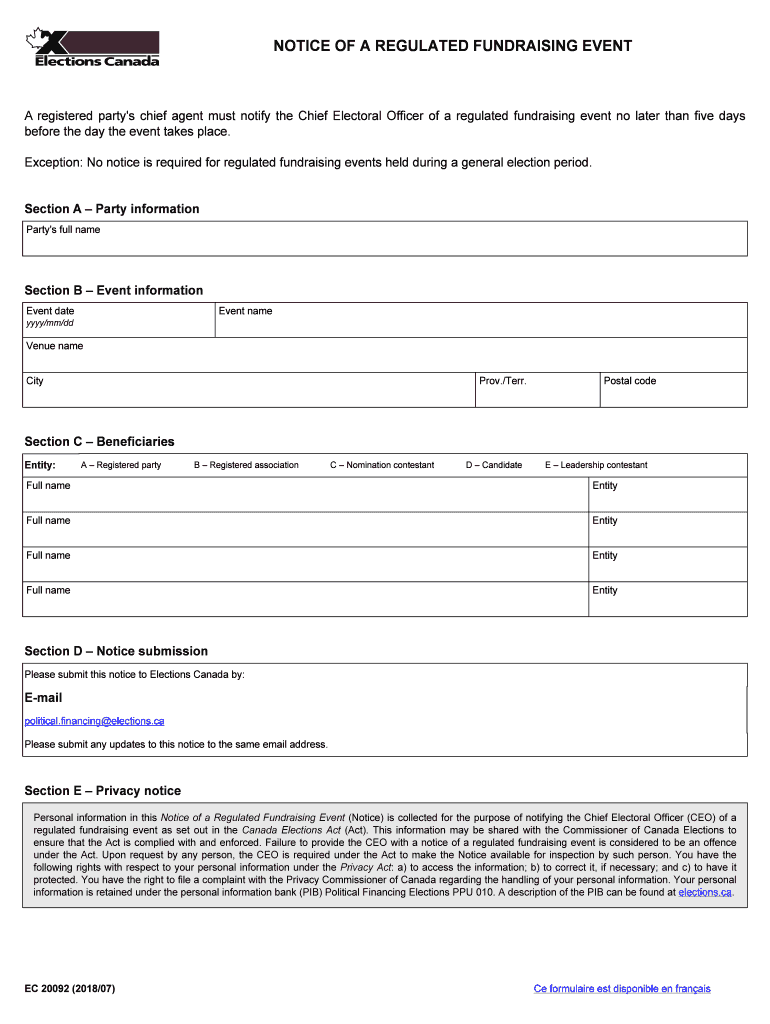 NOTICE OF A REGULATED FUNDRAISING EVENT registered party's chief agent must notify the Chief Electoral Officer of a regulated fundraising event no later than five days before the day the event takes