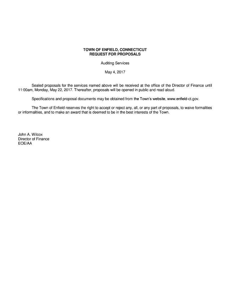 May 4, 2017Sealed proposals for the services named above will be received at the office of the Director of Finance until