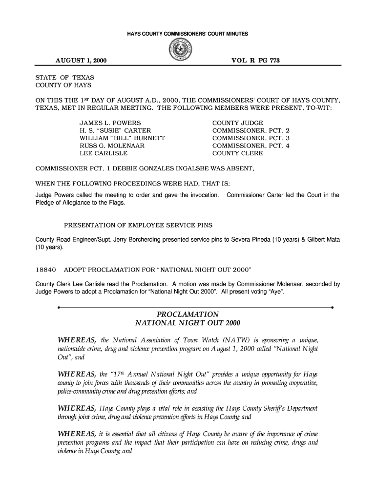 HAYS COUNTY COMMISSIONERS\' COURT MINUTESAUGUST 1, 2000