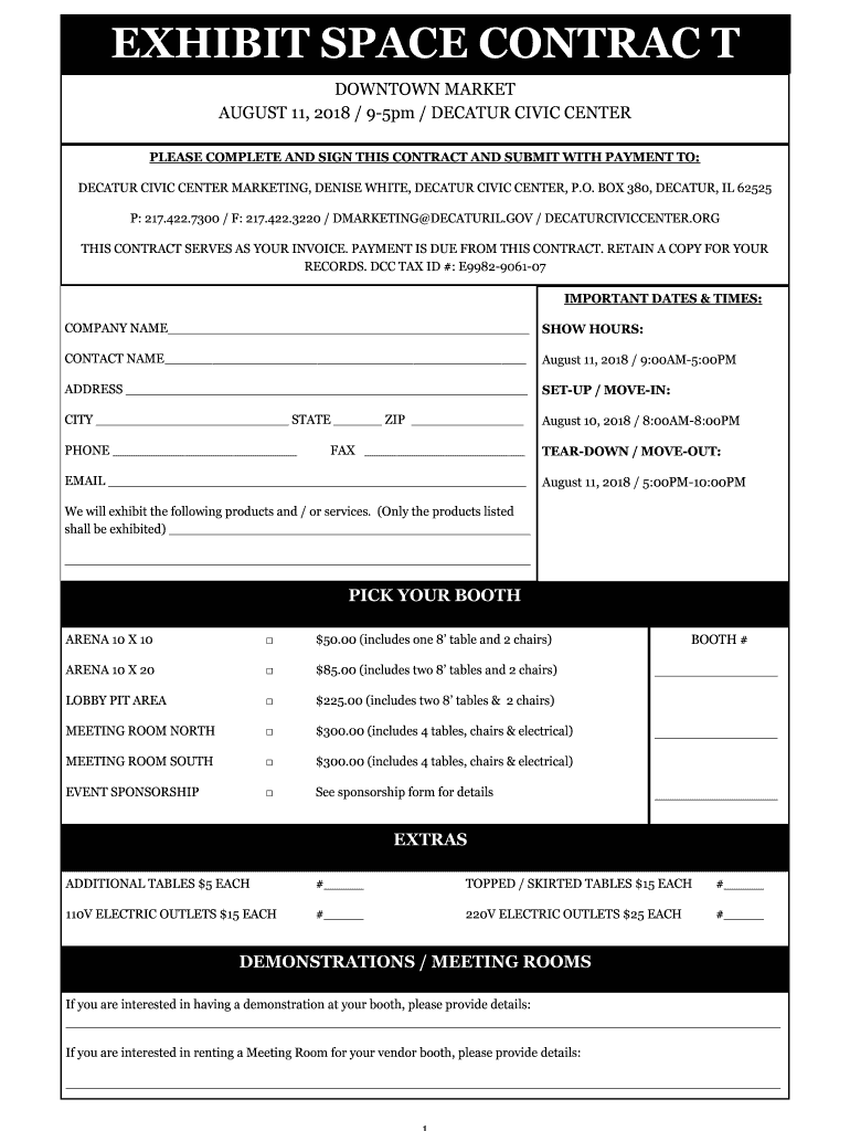 EXHIBIT SPACE CONTRACT T DOWNTOWN MARKET AUGUST 11, 2018 / 95pm / DECATUR CIVIC CENTER PLEASE COMPLETE AND SIGN THIS CONTRACT AND SUBMIT WITH PAYMENT TO: DECATUR CIVIC CENTER MARKETING, DENISE WHITE,