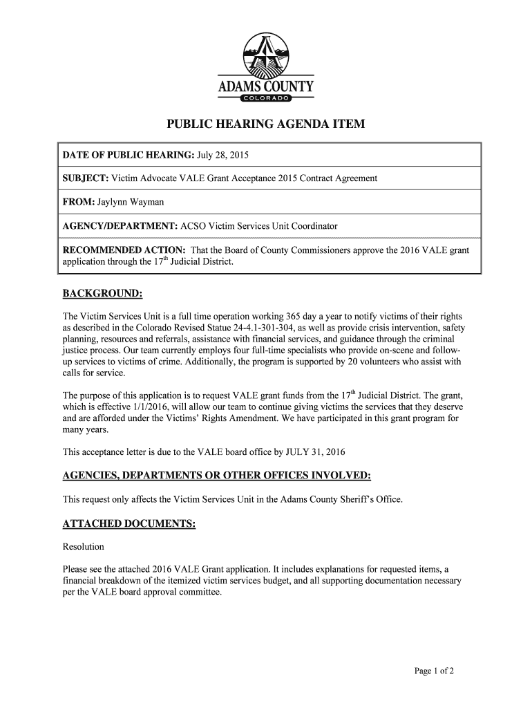 SUBJECT: Victim Advocate VALE Grant Acceptance 2015 Contract Agreement