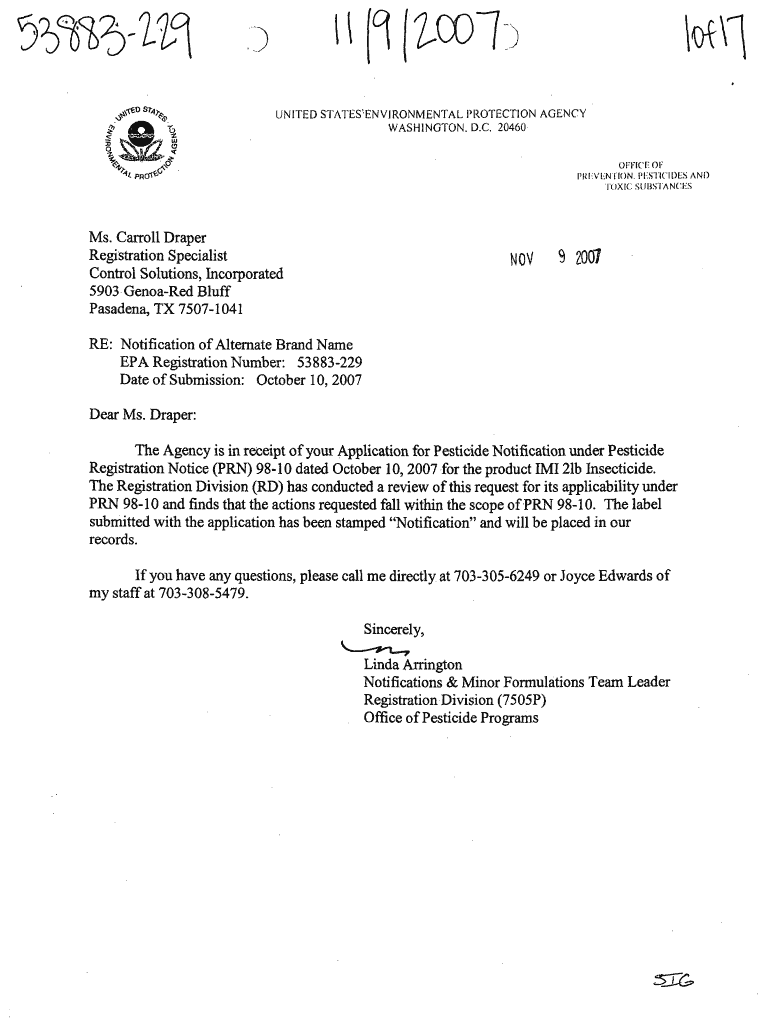 9 I(JJ l) UNITED STATES “ENVIRONMENTAL PROTECTION AGENCY WASHINGTON. D.C. 20460OFflCFOF PREVENTION. PESTICIDES AND TOXIC SUBSTANCES Ms. Carroll Draper Registration Specialist Control Solutions,