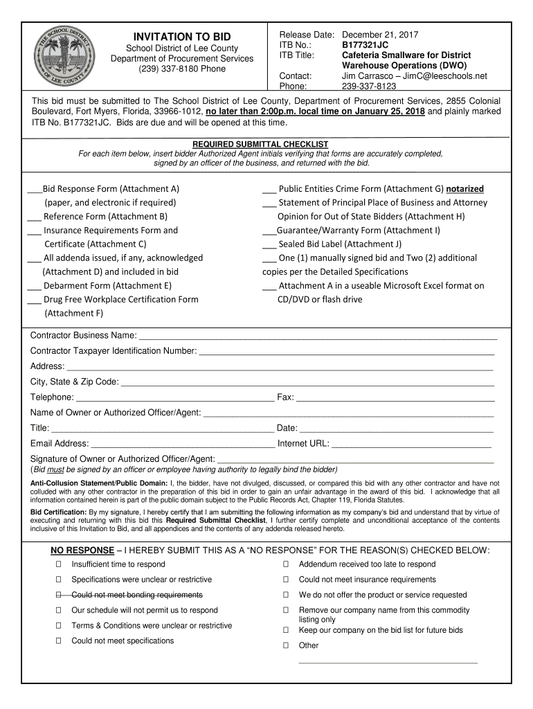 INVITATION TO BID School District of Lee County Department of Procurement Services (239) 3378180 Prerelease Date: December 21, 2017, ITB No.: B177321JC ITB Title: Cafeteria Small ware for District