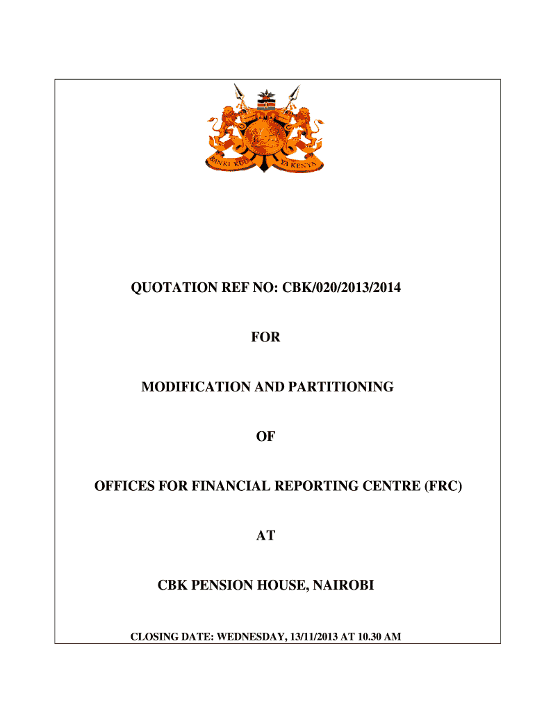 QUOTATION REF NO: CBC/020/2013/2014FORMODIFICATION AND PARTITIONINGOFOFFICES FOR FINANCIAL REPORTING Center (FRC)ATC PENSION HOUSE, NAIROBICLOSING DATE: WEDNESDAY, 13/11/2013 AT 10.30 SECTION A. NOTES
