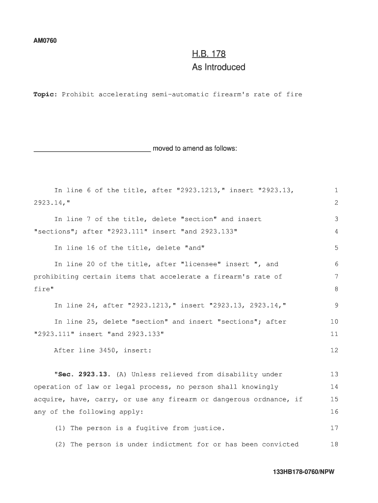 AM0760H. B. 178 As Introduced Topic: Prohibit accelerating semiautomatic firearm's rate of fire moved to amend as follows:In line 6 of the title, after “2923.1213, insert “2923.13, 2923.14, “1