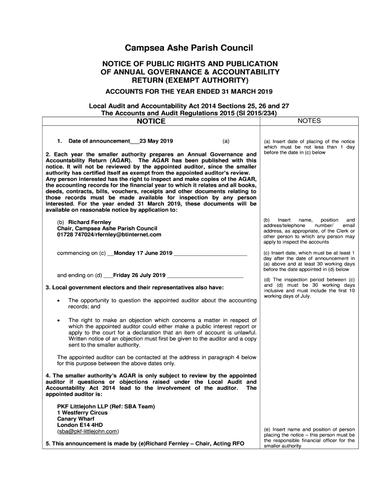 Camp sea Ashe Parish Council NOTICE OF PUBLIC RIGHTS AND PUBLICATION OF ANNUAL GOVERNANCE & ACCOUNTABILITY RETURN (EXEMPT AUTHORITY) ACCOUNTS FOR THE YEAR ENDED 31 MARCH 2019 Local Audit and Accountability
