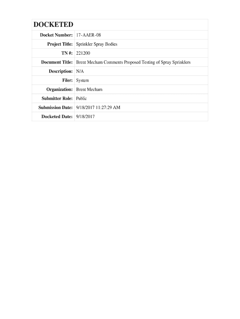 Document Title: Brent Mecca Comments Proposed Testing of Spray Sprinklers