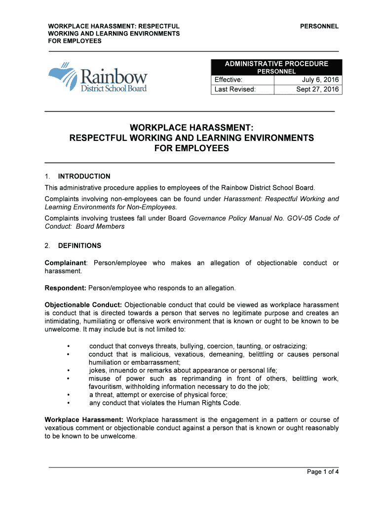 WORKPLACE HARASSMENT: RESPECTFUL PERSONNEL WORKING AND LEARNING ENVIRONMENTS FOR EMPLOYEES ADMINISTRATIVE PROCEDURE PERSONNELEffective: Last Revised:July 6, 2016, Sept 27, 2016 WORKPLACE HARASSMENT:RESPECTFUL