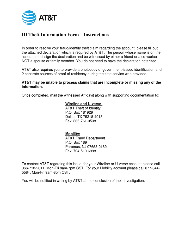 ID Theft Information Form Instructions In order to resolve your fraud/identity theft claim regarding the account, please fill out the attached declaration which is required by AT&T. The person whose