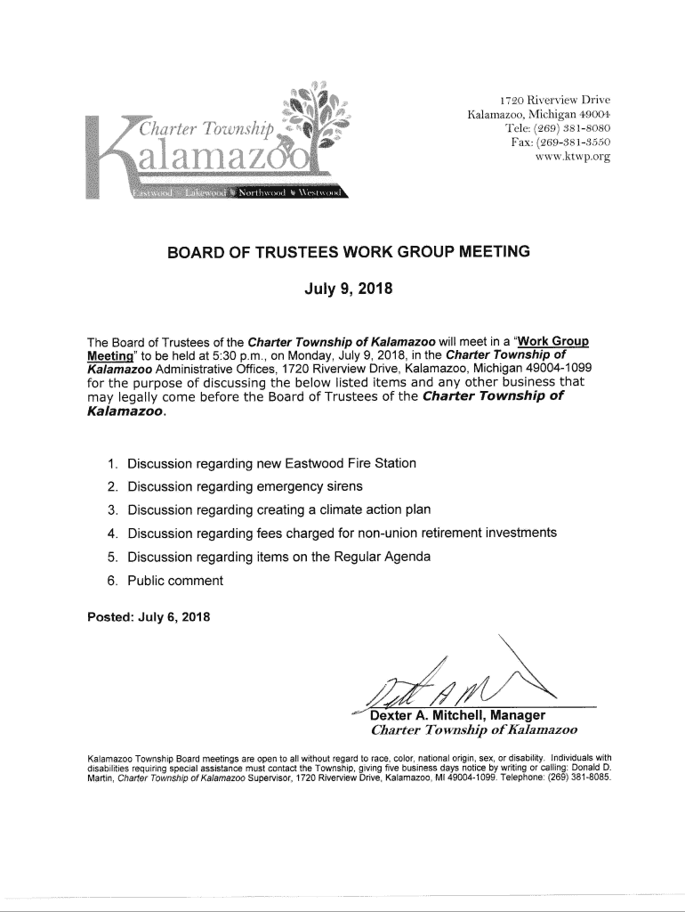 172o RiverviewKalamazoo, Michiganite oM49Tele (was) 3818oso tax (zaos8r355o www.ktwp.orgBOARD OF TRUSTEES WORK GROUP MEETING July 9, 2018, The Board of Trustees of the Charter Township of Kalamazoo