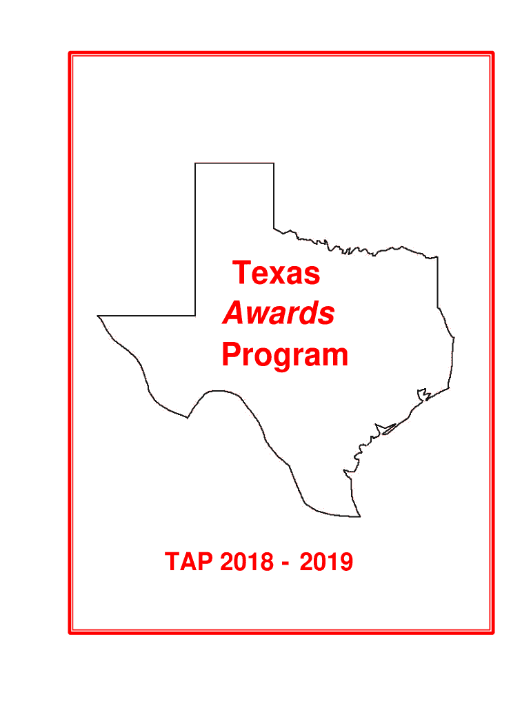 Texas Awards Program TAP 2018 20192018 19 TAP Page 2Foreword Texas Awards Program These Texas Awards Program (TAP) event guidelines are for Texas events only. These will be used at the Texas State