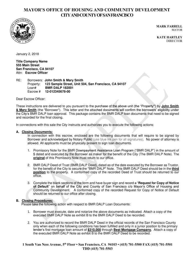 MAYORS OFFICE OF HOUSING AND COMMUNITY DEVELOPMENT CITYANDCOUNTYOFSAN FRANCISCO MARK FARRELL MAYORAL HARTLEY DIRECTOR January 2, 2018, Title Company Name 555 Main Street San Francisco, CA 94107 Attn: