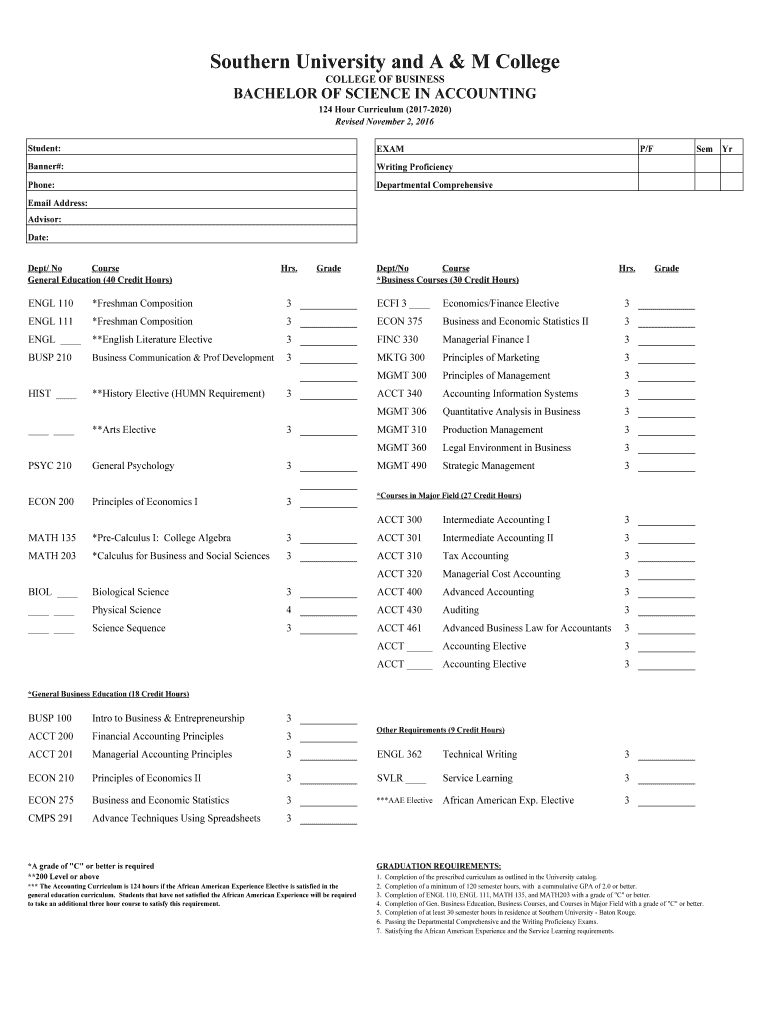 Southern University and A & M College OF BUSINESSBACHELOR OF SCIENCE IN ACCOUNTING 124 Hour Curriculum (20172020) Revised November 2, 2016, Student:Examiner#:Writing ProficiencyPhone:Departmental