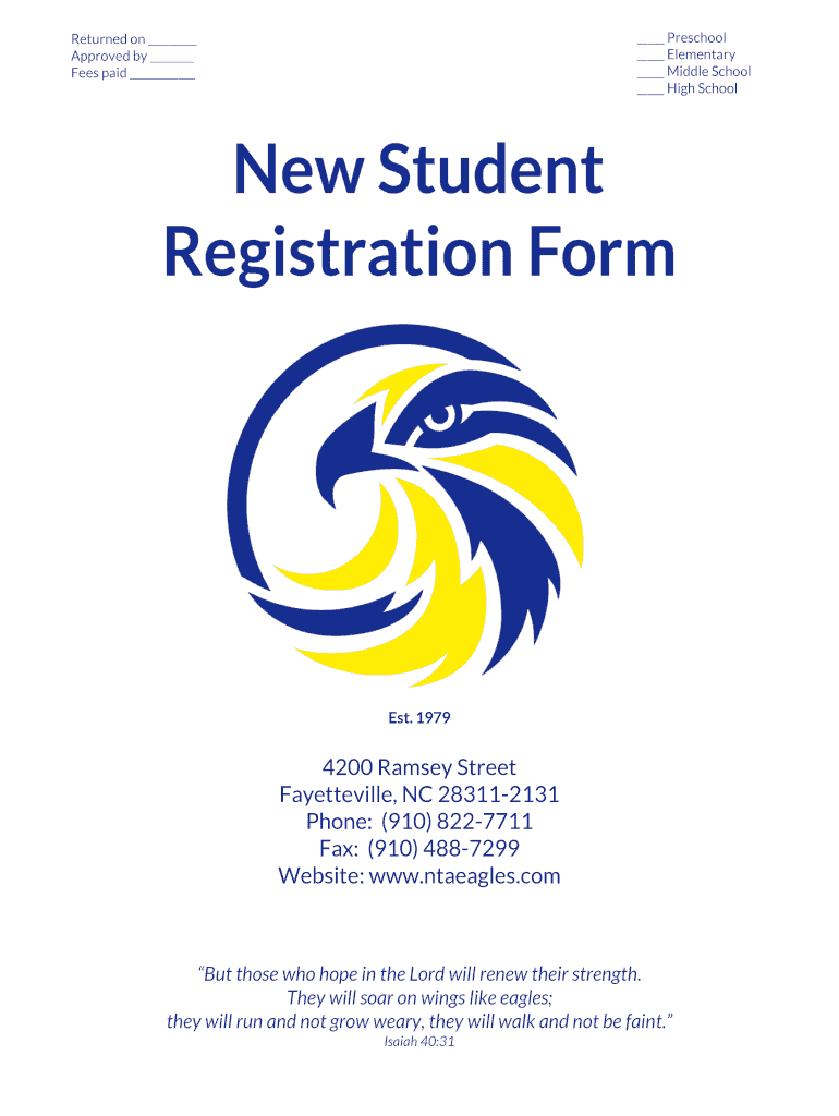 Preschool Elementary Middle School High SchoolReturned on Approved by Fees paid Est. 19794200 Ramsey Street Fayetteville, NC 283112131 Phone: (910) 8227711 Fax: (910) 4887299 Website: www.ntaeagles.comBut