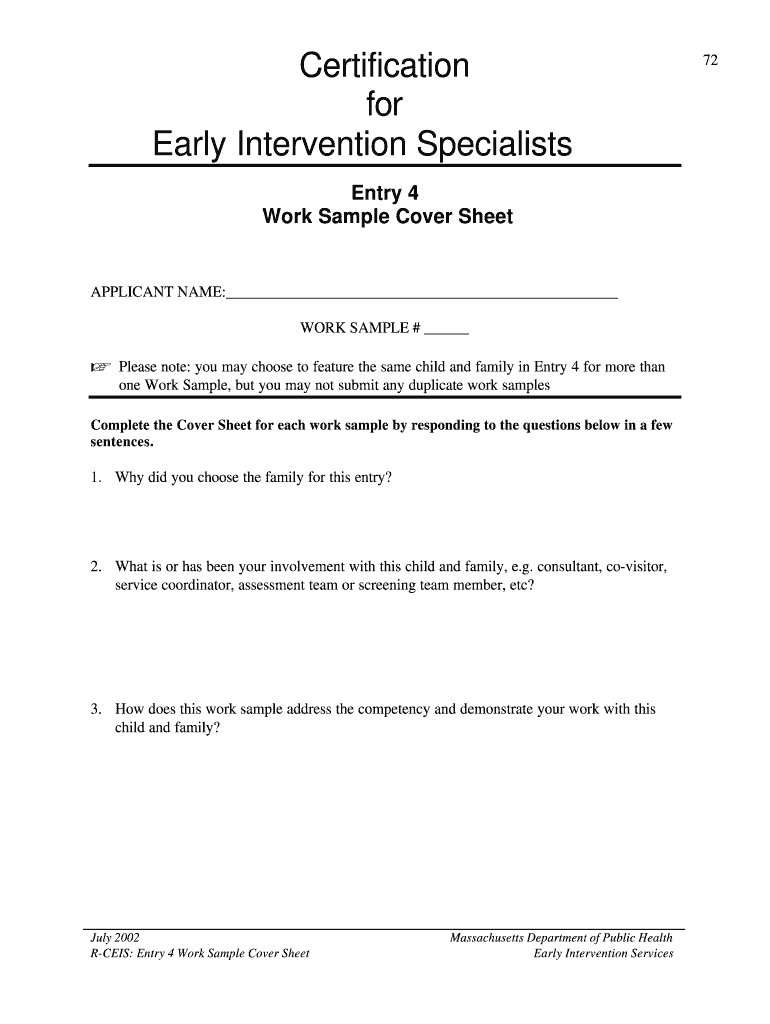 Certification for Early Intervention Specialists Entry 4 Work Sample Cover Sheet APPLICANT NAME: WORK SAMPLE # K Please note: you may choose to feature the same child and family in Entry 4 for more