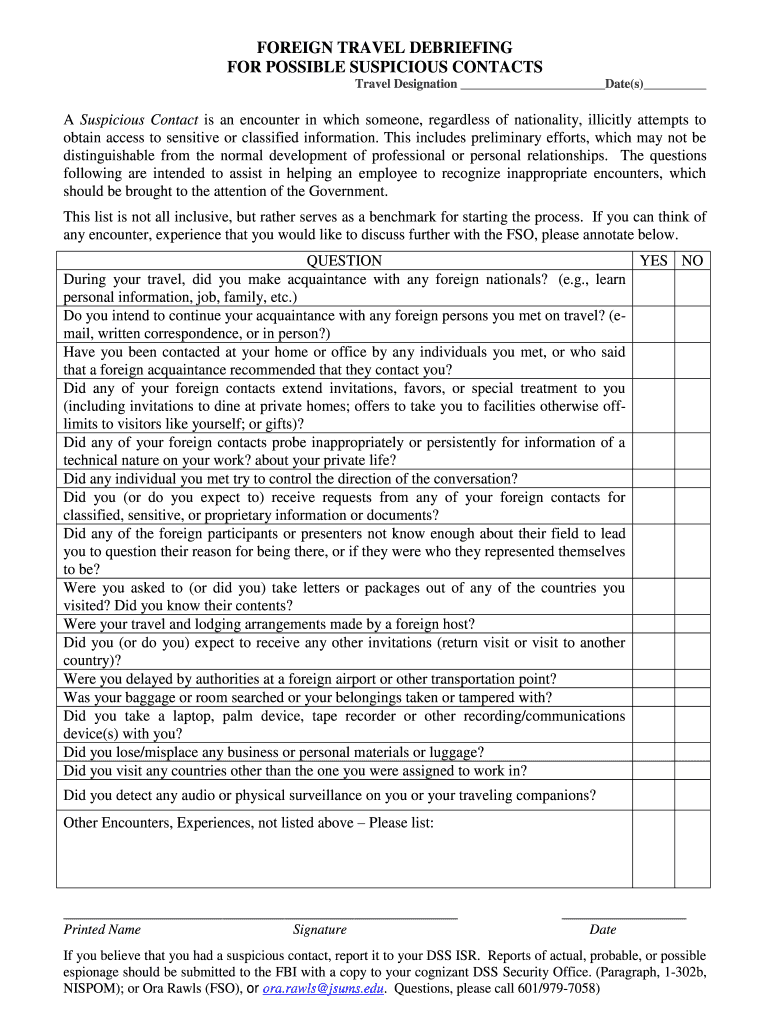 FOREIGN TRAVEL DEBRIEFING FOR POSSIBLE SUSPICIOUS CONTACTS Travel Designation Date(s) A Suspicious Contact is an encounter in which someone, regardless of nationality, illicitly attempts to obtain
