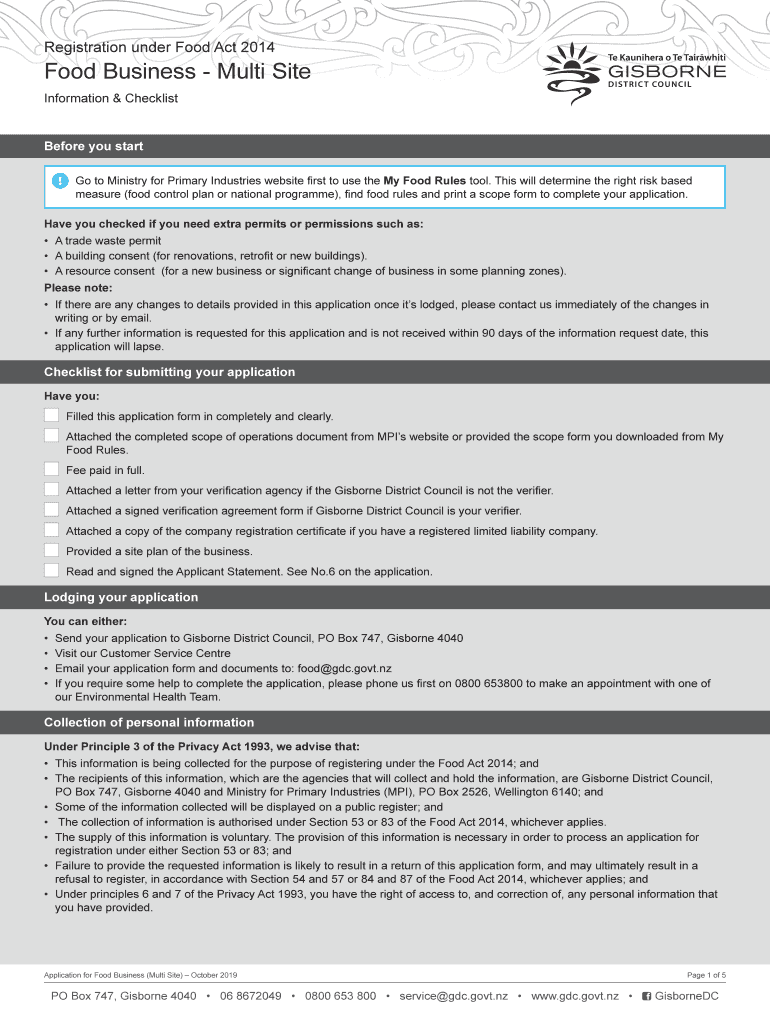 Registration under Food Act 2014Food Business Multi Site Information & ChecklistBefore you start Go to Ministry for Primary Industries website first to use the Food Rules tool. This will determine