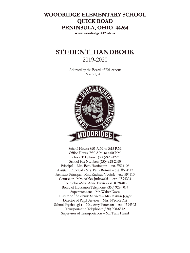 WOODRIDGE ELEMENTARY SCHOOL QUICK ROAD PENINSULA, OHIO 44264 www.woodridge.k12.oh.usSTUDENT HANDBOOK 20192020Adopted by the Board of Education: May 21, 2019School Hours: 8:55 A.M. to 3:15 P.M. Office