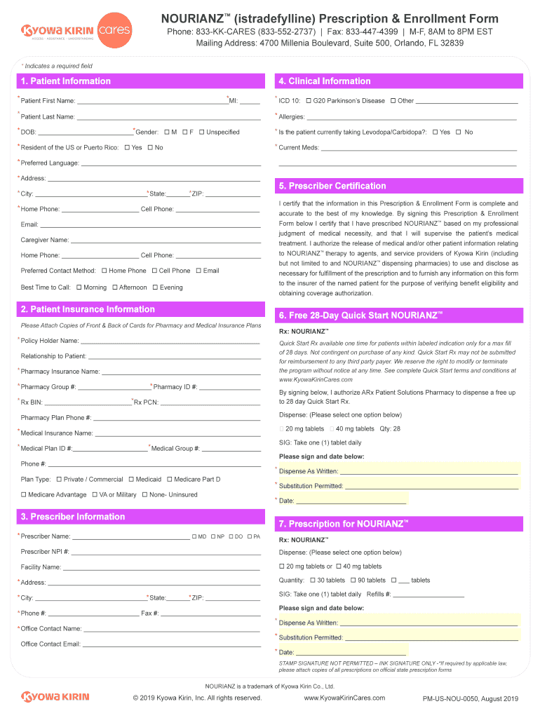 TOURING (istradefylline) Prescription & Enrollment Form Phone: 833KKCARES (8335522737) Fax: 8334474399 MF, 8AM to 8PM EST Mailing Address: 4700 Millennia Boulevard, Suite 500, Orlando, FL 32839* Indicates