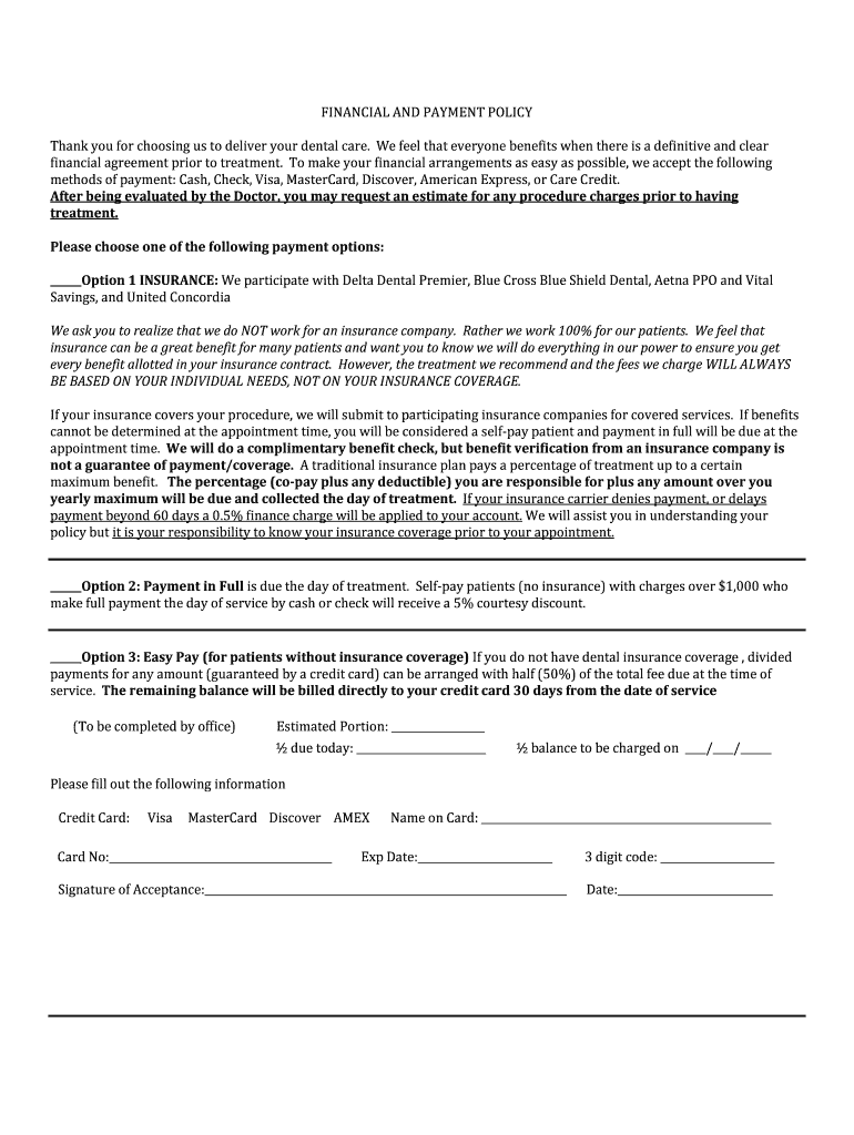 FINANCIAL AND PAYMENT POLICYThank you for choosing us to deliver your dental care. We feel that everyone benefits when there is a definitive and clear