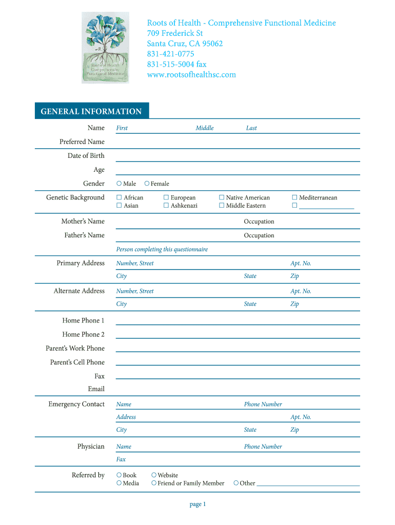 Roots of Health Comprehensive Functional Medicine 709 Frederick St Santa Cruz, CA 95062 8314210775 8315155004 fax www.rootsofhealthsc.comGENERAL INFORMATION NameFirstMiddleLastPreferred Name Date