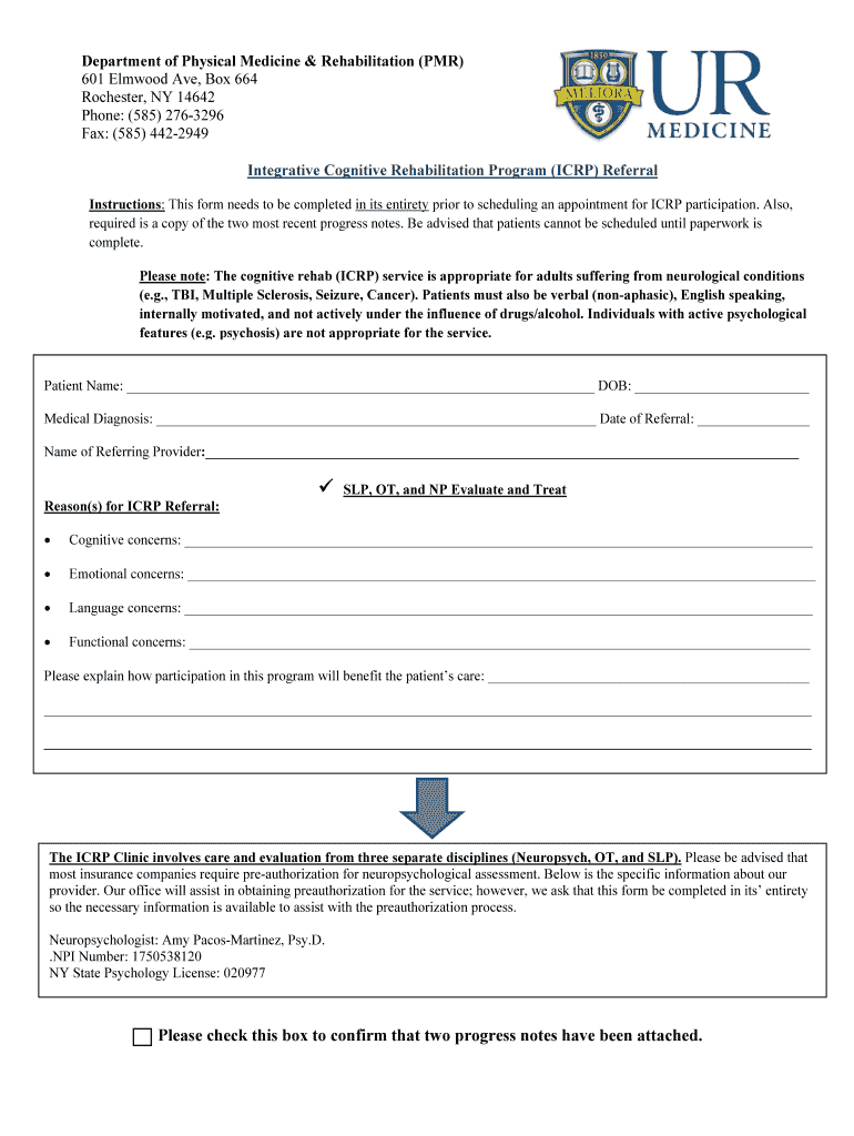 Department of Physical Medicine & Rehabilitation (PMR) 601 Elmwood Ave, Box 664 Rochester, NY 14642 Phone: (585) 2763296 Fax: (585) 4422949 Integrative Cognitive Rehabilitation Program (ICP) Referral