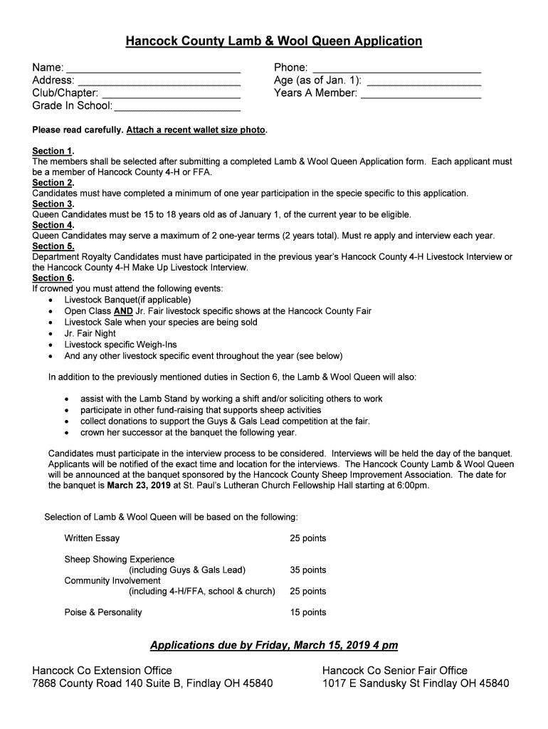 Hancock County Lamb & Wool Queen Application Name: Address: Club/Chapter: Grade In School: Phone: Age (as of Jan. 1): Years A Member: Please read carefully. Attach a recent wallet size photo. Section