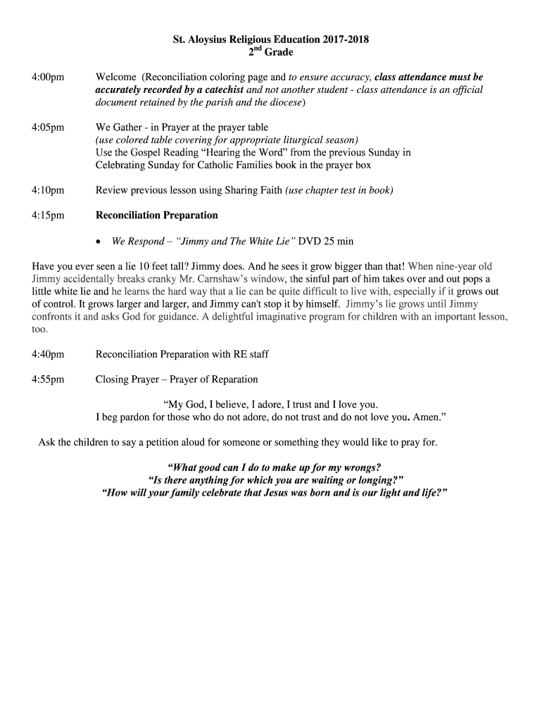 St. Elysium Religious Education 20172018 2nd Grade 4:00pmWelcome (Reconciliation coloring page and to ensure accuracy, class attendance must be accurately recorded by a catechist and not another student