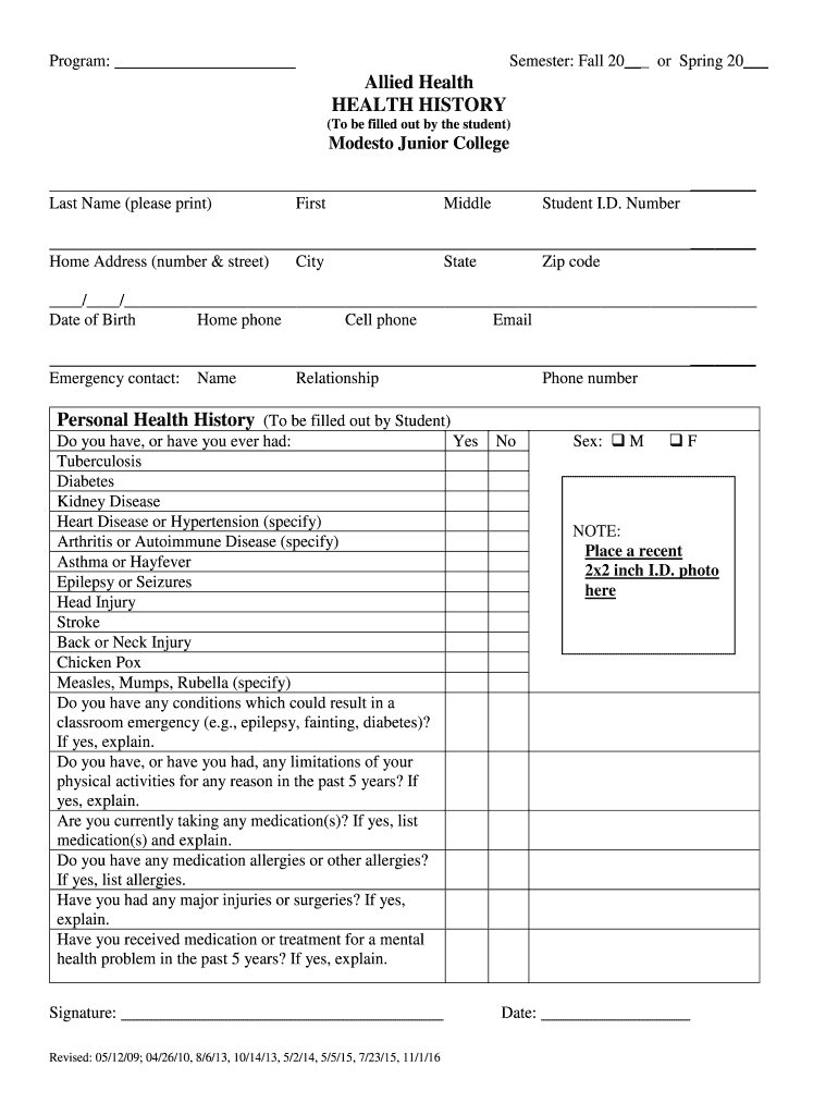 Program:Semester: Fall 20 or Spring 20 Allied Health, HEALTH HISTORY (To be filled out by the student)Modesto Junior College Last Name (please print)FirstMiddleStudent I.D. Number Home Address (number